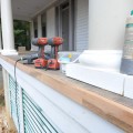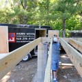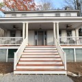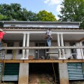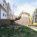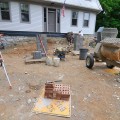 A welcome Spring opportunity. After a very long winter, we were finally able to break ground–well, break up the old porch first, actually. Cleveland McCune and his son, of Cleveland’s Earthworks, were on hand to safely remove the old patio structure and shape the ground to accept the larger entry. Master mason Curtis Lowry and Tommy Folks, of Lowry Masonry, snatched up the piers and our own crew followed close behind with the floor framing.